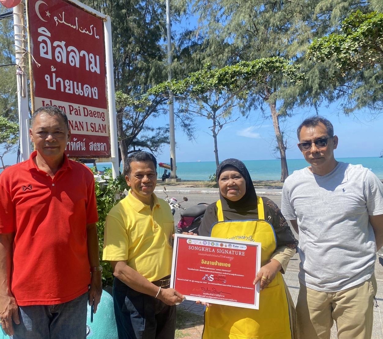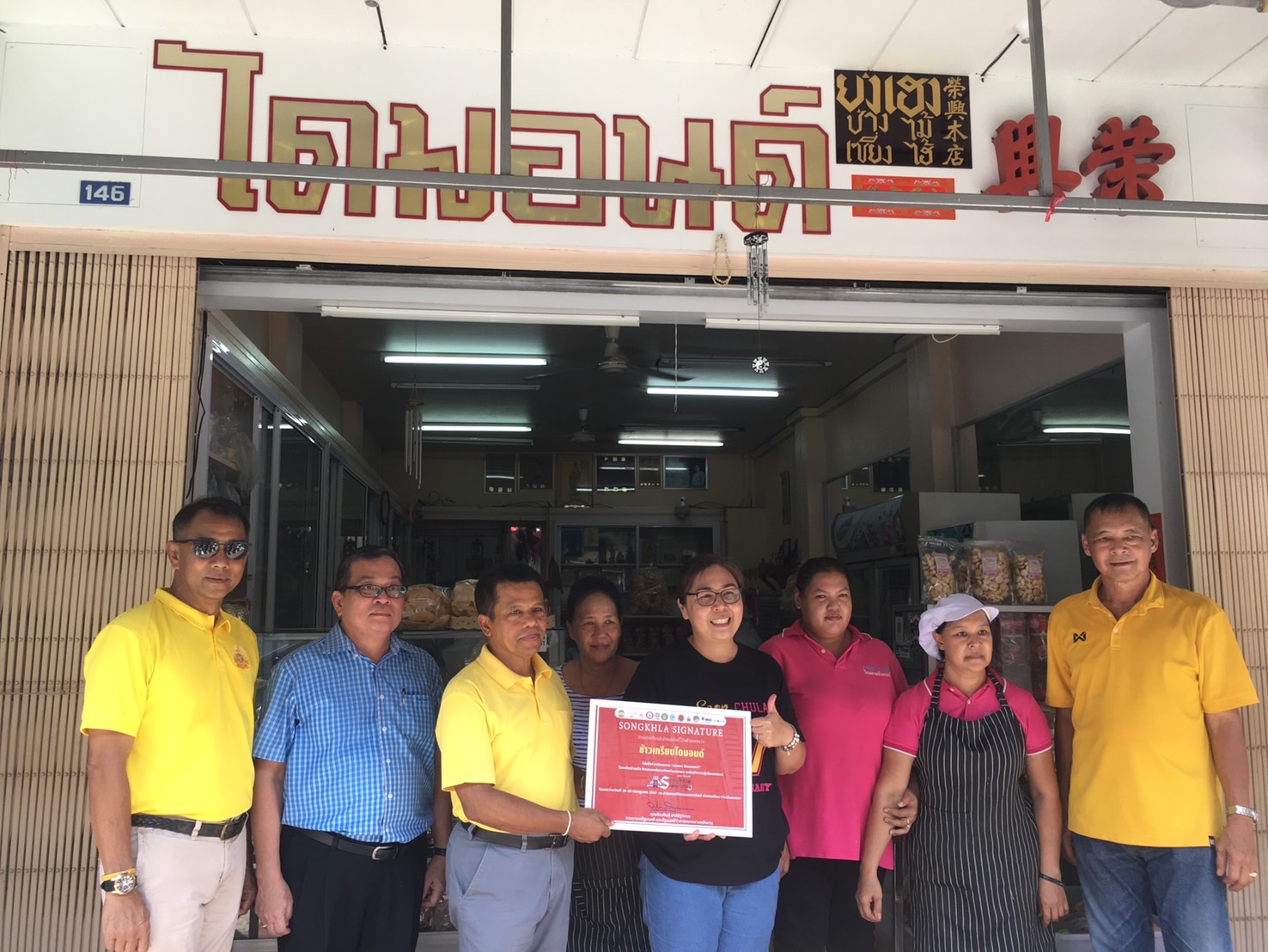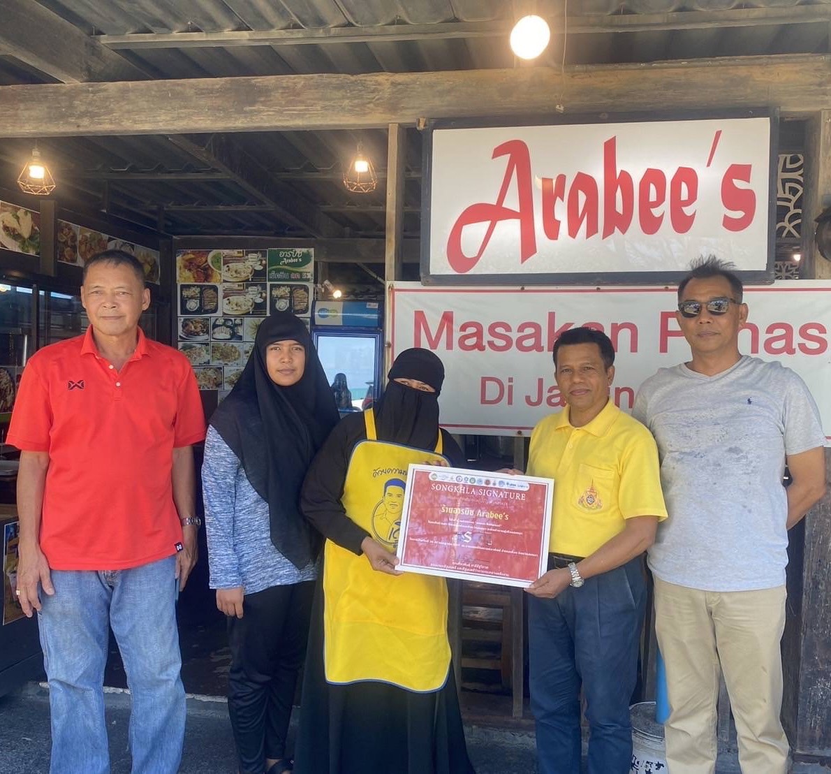“ เพื่อเป็นกำลังใจให้กับผู้ประกอบการร้านอาหารในพื้นที่อำเภอเมืองสงขลา “นายพีระพันธุ์ สาลีรัฐวิภาค รองนายกรัฐมนตรีและรัฐมนตรีว่าการกระทรวงพลังงาน“ ได้ให้เกียรติลงนามในประกาศเกียรติบัตร เพื่อแสดงว่าเป็นร้านอาหารอร่อย เป็นซิกเนเจอร์ระดับตำนานของเมืองสงขลา