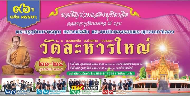 มื่อวันที่ 21 ก.พ. 2567 เวลา 9.00น. ณ.ที่วัดละหารใหญ่จัดพิธีแสดงมุทิตาจิต ฉลองอายุวัฒนมงคล พระครูสุภัททาจารคุณ หลวงปู่สิน ครบรอบ ๘ รอบ ๙๖ ปี ๗๒ พรรษา โดยมี นายไตรภพ วงษ์ไตรรัตน์ ผู้ว่าราชการจังหวัดระยอง จุดเทียนชัย และ นาย กำธร เวหน รองผู้ว่าราชการจังหวัดระยอง และ นายปิยะ ปิตุเตชะ นายกองค์การบริหารส่วนจังหวัดระยอง พร้อมด้วยบรรดาศิษย์ยานุศิษย์สำหรับหลวงปู่สิน ประชาชน ทุกหมู่เหล่า ร่วมพิธี จำนวนมาก