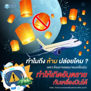AOT จึงขอความร่วมมือประชาชนงดการจุด และปล่อยบั้งไฟ พลุ ตะไล โคมลอย โคมไฟ โคมควัน หรือวัตถุอื่นที่คล้ายคลึงกันขึ้นสู่อากาศภายในเขตปลอดภัยในการเดินอากาศ ตามมาตราที่ 59/1 แห่งพระราชบัญญัติการเดินอากาศ พ.ศ.2497 ได้ห้ามไว้ หากฝ่าฝืนมีบทลงโทษสูงสุด คือจำคุกไม่เกิน 5 ปีหรือปรับไม่เกิน 200,000 บาทหรือทั้งจำทั้งปรับ และหากมีการทำให้อากาศยานในระหว่างบริการเสียหาย จนไม่สามารถทำการบินได้หรืออาจเกิดอันตรายต่อความปลอดภัยของอากาศยานในระหว่างบิน ต้องระวางโทษประหารชีวิต จำคุกตลอดชีวิตหรือจำคุกตั้งแต่ 15 ปี ถึง 20 ปี และปรับตั้งแต่ 600,000 บาท ถึง 800,000 บาท