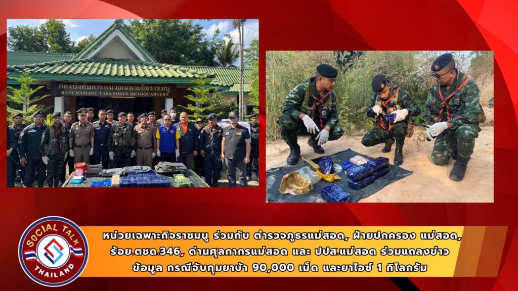 วันที่ 21 พฤศจิกายน 2567 หน่วยเฉพาะกิจราชมนู ร่วมกับ ตำรวจภูธรแม่สอด, ฝ่ายปกครอง แม่สอด, ร้อย.ตชด.346, ด่านศุลกากรแม่สอด และ ปปส.แม่สอด ร่วมแถลงข่าว ข้อมูล กรณีจับกุมยาบ้า 90,000 เม็ด และยาไอซ์ 1 กิโลกรัม