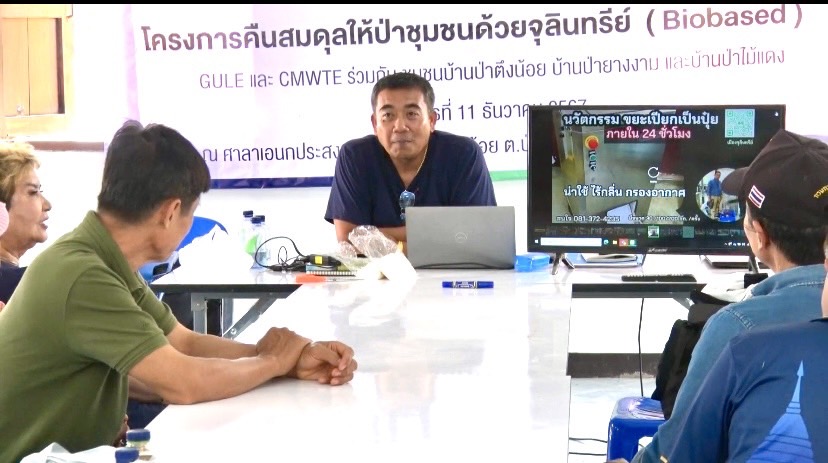 กิจกรรมในวันนี้ ต่อเนื่องจากการขยายโครงการ “คืนสมดุลให้ป่าด้วยจุลินทรีย์ “ โดยการส่งเสริมและสนับสนุน จาก GULF CMWTE ซึ่งมีนโยบายในการพัฒนาสังคมและสิ่งแวดล้อม และได้ให้ความสำคัญต่อขบวนการของชุมชนในการแก้ปัญหาไฟป่า และ มลภาวะอากาศ PM 2.5 ซึ่งเป็นปัญหาสำคัญของพื้นที่ฯ รวมถึงการอนุรักษ์ฟื้นฟูป่าไม้ระบบนิเวศในระยะยาว จึงได้เข้ามามีส่วนร่วมกับผู้นำชุมชน ตำบลป่าป้อง อำเภอดอยสะเก็ด จังหวัดเชียงใหม่ ซึ่งในช่วงดือนตุลาคม-ถึงพฤศจิกายน 2567 ที่ผ่านมา ได้มีการจัดอบรมความรู้และจัดตั้งศูนย์เรียนรู้และธนาคารจุลินทรีย์ชุมชน โดยร่วมกับ กำนันตำบลป่าป้อง อ.ดอยสะเก็ด ฯที่บ้านทุ่งยาว หมู่ 8 ฯ และ กิจกรรมในวันนี้ เป็นการขยายพื้นที่ใหม่ ร่วมกับทั้ง 3 หมู่บ้าน คือ หมู่ 1 หมู่ 2 และหมู่ 7 มาผนึกกำลังร่วมกันกับ GULF CMWTE จัดกิจกรรม เพื่อเป็นการเสริมศักยภาพการขับเคลื่อนการดูแลรักษาฟื้นฟูป่าแก้ปัญหาป่าเสื่อมโทรมของป่าไม้และไฟป่า ฯลฯ ให้มีประสิทธิภาพมากยิ่งขึ้น โดยได้รับการส่งเสริมจาก วิทยากรจาก GULF CMWTE จัดกระบวนการร่วมกับผู้นำชุมชน (Work Shop) แลกเปลี่ยนเรียนรู้เกี่ยวกับสภาพปัญหา การดำเนินงานที่ผ่านมาและปัญหาอุปสรรคต่างๆ ทบทวนแนวทางการพัฒนาการทำงานที่จะก่อเกิดประสิทธิภาพ ต่อไป และ ได้ร่วมกันกำหนดยุทธศาสตร์และการบริหารจัดการให้เป็นระบบเป็นองค์กรชุมชน และมีแผนงานจัดตั้งเป็นเรียนรู้และธานคารจุลินทรีย์ชุมชน ในปลายเดือนมกราคม 2567 จะจัดตั้งศูนย์เรียนรู้และธนาคารจุลินทรีย์ชุมชนร่วมกัน ซึ่งวันนี้ได้รับการอบรมเรียนรู้องค์ความรู้การการผลิตชีวภัณฑ์ต่างๆ และ การนำจุลินทรีย์ ไปใช้เป็นประโยชน์ต่อการฟื้นฟูป่า อาทิ การนำองค์ความรู้จากการวิจัยและผลงานวิชาการจากหลายสถาบันการศึกษา นำมาใช้ เช่น นำเชื้อราไมคอร์ไรซ่า และ เชื้อเห็ดป่า จุลินทรีย์ท้องถิ่น เช่น จุลินทรีย์จาวปลวก ไตรโคเดอร์มา มาใช้ฟื้นฟูดินจุลินทรีย์ในป่าและระบบนิเวศป่าไม้ การใช้จุลินทรีย์อีเอ็มผลิตปุ๋ยน้ำ ปุ๋ยหมัก อีเอ็มบอล การพัฒนาปุ๋ยจากเศษอาหาร ใบไม้ เศษพืชผลทางการเกษตรมาพัฒนาคุณสมบัติทดแทนปุ๋ยเคมี ฯลฯ และการพัฒนาผลิตภัณฑ์ชีวภาพด้านการเกษตร ปุ๋ย สารไล่แมลง ชีวภาพแก้โรคพืช ต่างๆ ฯลฯ ซึ่งชุมชนจะสามารถผลิตใช้ในชุมชน และเป็นได้เอง และเป็นการพัฒนาธุรกิจชุมชน การผลิตอาหารปลอดภัย ลดรายจ่ายเพิ่มรายได้ สร้างอาชีพแก่ชุมชน ควบคู่กับการฟื้นฟูป่าไม้ ซึ่งผู้นำในที่ประชุมเห็นพ้องต้องกันว่า เป็นแนวทางที่แก้ปัญหาการทำงาน และเป็นจะเป็นโอกาสเสริมศักยภาพในการทำงานที่เป็น