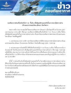 พลอากาศโท ประภาส สอนใจดี โฆษกกองทัพอากาศ เปิดเผยว่า เมื่อวันศุกร์ที่ 20 ธันวาคม 2567 เวลาประมาณ 11.00 นาฬิกา ที่ผ่านมา กองทัพอากาศได้ส่งเครื่องบินขับไล่ F-16 จำนวน 2 เครื่อง ขึ้นบิน เพื่อพิสูจน์ฝ่ายและสกัดกั้นอากาศยานไม่ทราบฝ่าย ซึ่งเรดาร์ของกองทัพอากาศตรวจพบบริเวณชายแดนไทย-เมียนมา โดยมีข้อมูลดังนี้