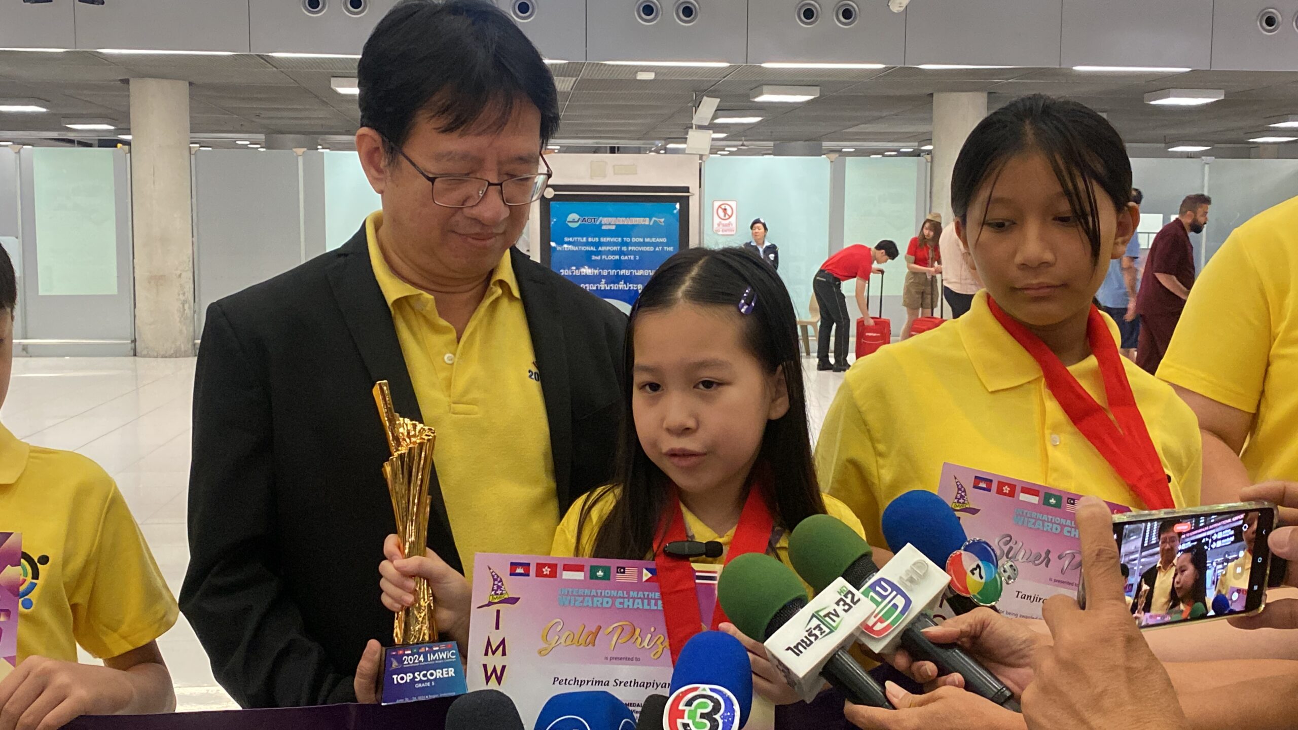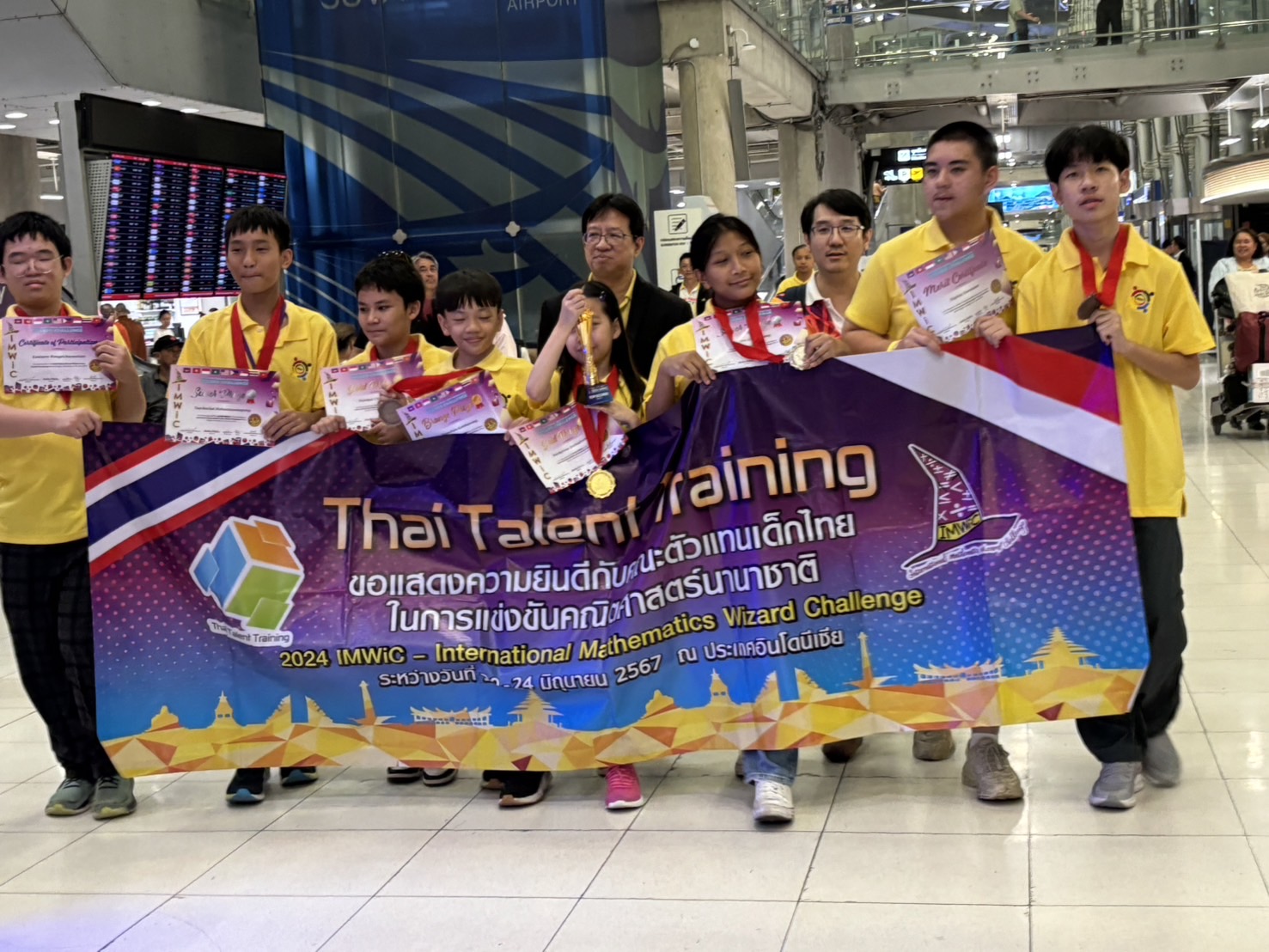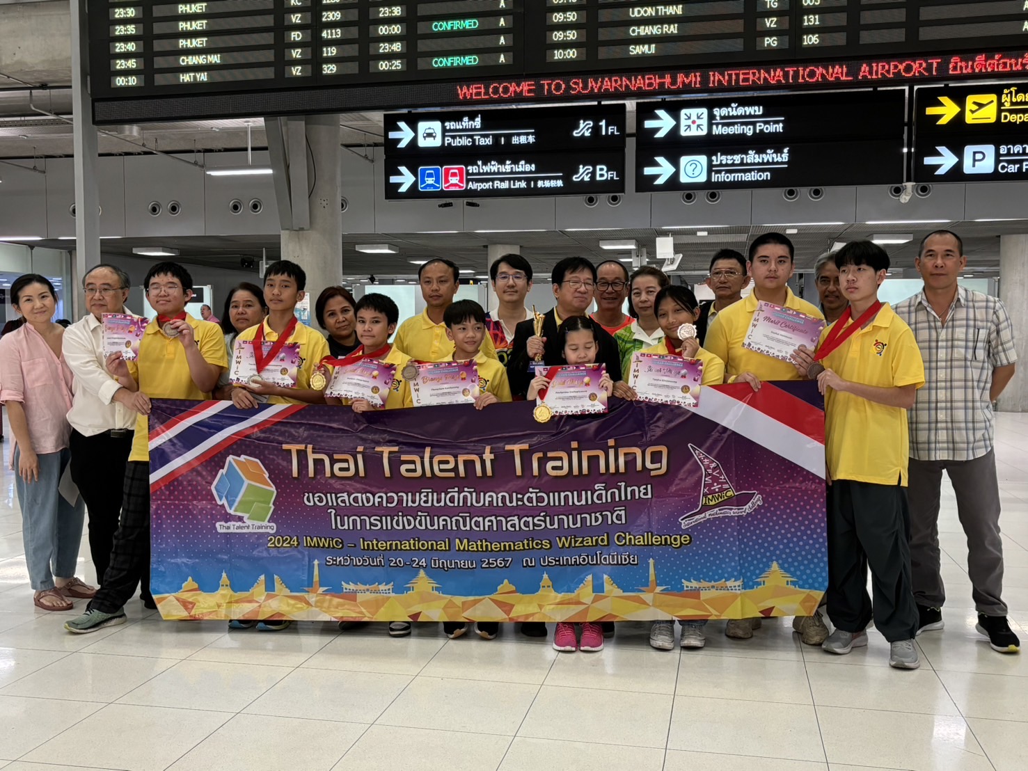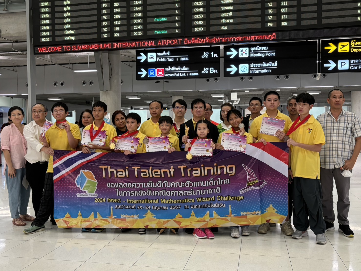 *****เมื่อเวลา 23.50 น.วันที่ 25 มิ.ย.2567 ที่สนามบินสุวรรณภูมิ นายภูมิเทพ คลังอุไร ประธาน Thai Talent Training พร้อมคณะ รวมทั้ง ผู้ปกครองเดินทางมารับคณะรักเรียน ที่เดินทางกลับถึงประเทศไทย เที่ยวบิน TG 436 เวลา 22.37 น.จากการแข่งขัน คณิตศาสตร์นานาชาติ คว้าตำแหน่งแชมเปี้ยนเกรด 5 กับรายการ 2024 IMWiC ณ เมืองโบกอร์ ประเทศอินโดนีเซีย โดยสามารถคว้าตำแหน่งแชมเปี้ยนของเกรด 5 มาครองพร้อมทั้งรางวัลเหรียญทอง 2 รางวัล เหรียญเงิน 2 รางวัล เหรียญทองแดง 3 รางวัล กับอีก 1 รางวัลชมเชย