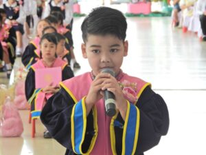 นักเรียนตัวแทนของแต่ละระดับชั้นได้กล่าวขอบคุณคุณพ่อคุณแม่ คุณครู และโรงเรียน ทั้งในภาษาไทย ภาษาอังกฤษ และภาษาจีน