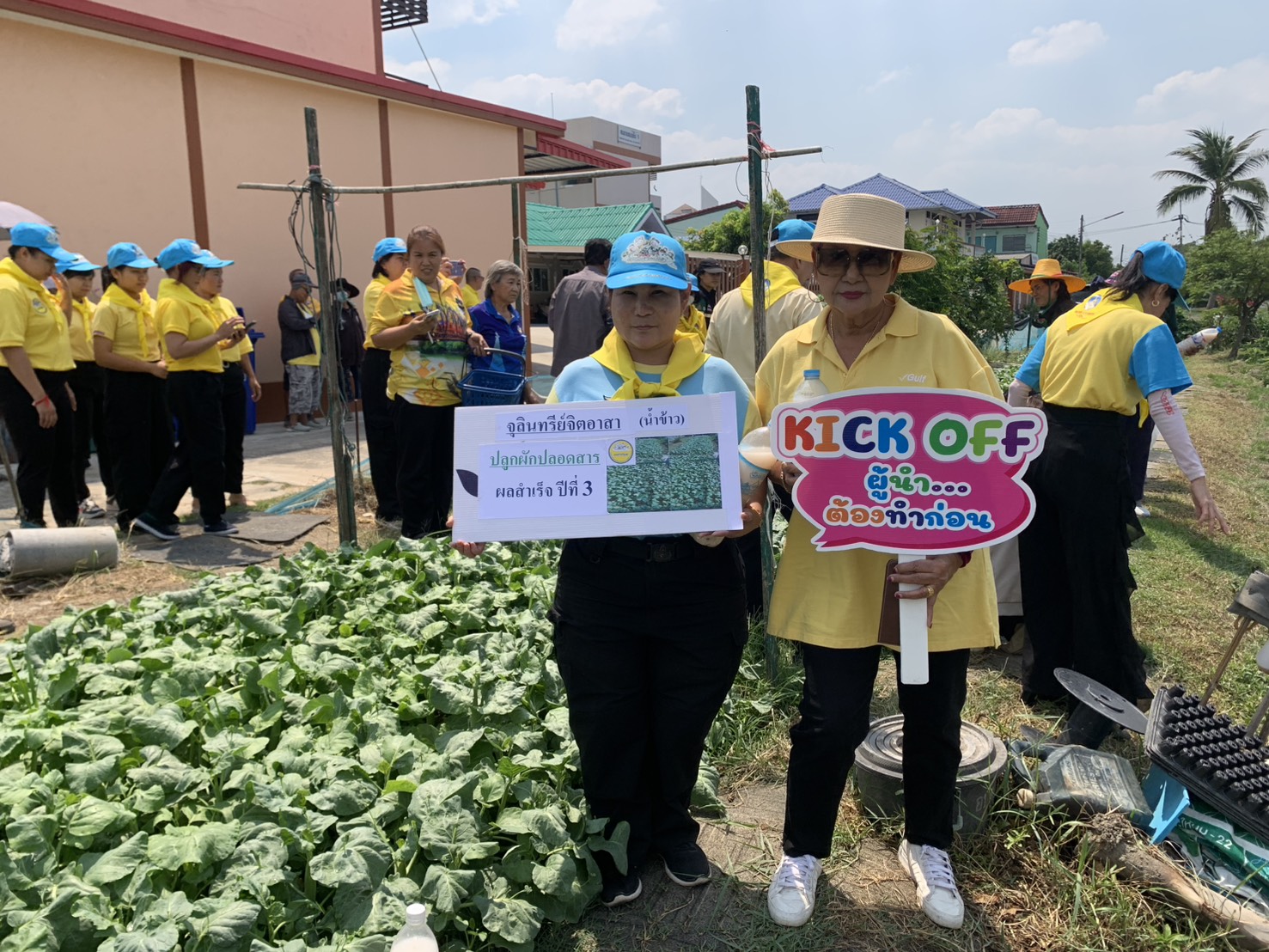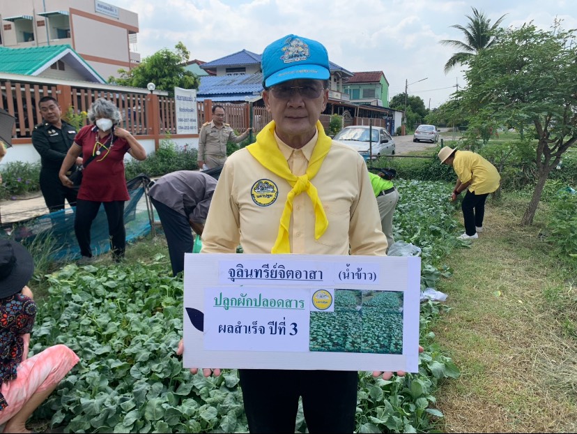 โครงการ จิตอาสาปลูกผักปลอดสารพิษด้วยจุลินทรีย์จิตอาสาน้ำข้าว แจกประชาชนฟรี ปีที่ 3 รวม 25 ครั้ง โดยการส่งเสริมด้านจุลินทรีย์จิตอาสาน้ำข้าว โดย อาจารย์วิรัช จำปานิล (ลุงอ๊อดจิตอาสา) และ ผู้รับผิดชอบจิตอาสา โครงการในการจัดการแปลงปลูกผัก ได้แก่ รต.ประยูร กลิ่นผล รท.วิรัช ศรีชัยกุล และ รต.สมโชคเพ็งเล็ง เป็นผู้ดำเนินกิจกรรมแปลผักดังกล่าว ซึ่งได้ใช้ที่ดินรกร้างว่างเปล่าสาธารณะในชุมชน ปลูกผักเพื่อแจกฟรีแก่คนในชุมชนและโดยรอบชุมชน ผลิตผักปลอดสารพิษด้วยจุลินทรีย์จิตอาสาน้ำข้าวแจกจ่ายแก่พี่น้องประชาชนฟรีๆ นอกจากนั้นโครงการนี้ยังเป็นประโยชน์ในการลดขยะเศษอาหารในครัวเรือนชุมชน นำมาหมักกับใบไม้เป็นดินคุณภาพที่มีอินทรีย์วัตถุและธาตุอาหารแก่ดินสำหรับปลูกพืชได้เป็นอย่างดี และ ยังนำเศษข้าวที่เหลือกิน น้ำซาวข้าว ข้าวที่ติดหม้อน้ำล้างหม้อข้าวที่เหลือ ที่จะต้องทิ้งไปเป็นมลพิษในท่อน้ำทิ้งและสิ่งแวดล้อม ถูกนำกลับมาเพาะเลี้ยงจุลินทรีย์จิตอาสาน้ำข้าว ซึ่งสามารถใช้ประโยชน์ในการหมักเศษอาหารครัวเรือนหมักให้เป็นดินคุณภาพได้ไม่เน่าเสียหรือมีกลิ่นเหม็น ยังใช้ในการบำบัดน้ำเสียในชุมชน ดับกลิ่นเหม็นคอกสัตว์ ครัวเรือนและแม่น้ำลำคลอง และ ยังใช้ทางการเกษตรปลูกผักเสริมสร้างความมั่นคงทางอาหารชุมชนลดรายจ่ายของคนในชุมชนได้ด้วย รวมทั้งเกิดกระบวนการรวมกลุ่มและการมีส่วนร่วมในชุมชนสร้างความรักสามัคคีในชุมชนด้วย