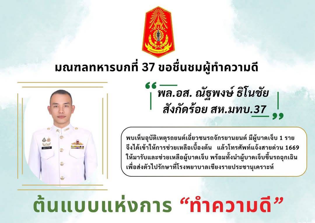 พลอาสาสมัคร ณัฐพงษ์ ธิโนชัย** กำลังพลสังกัดกองร้อยทหารสารวัตร มณฑลทหารบกที่ 37 ได้เข้าช่วยเหลือผู้ประสบอุบัติเหตุรถจักรยานยนต์ชนกัน บริเวณปากทางเข้าชุมชนรั้วเหล็กใต้ เขตเทศบาลนครเชียงราย