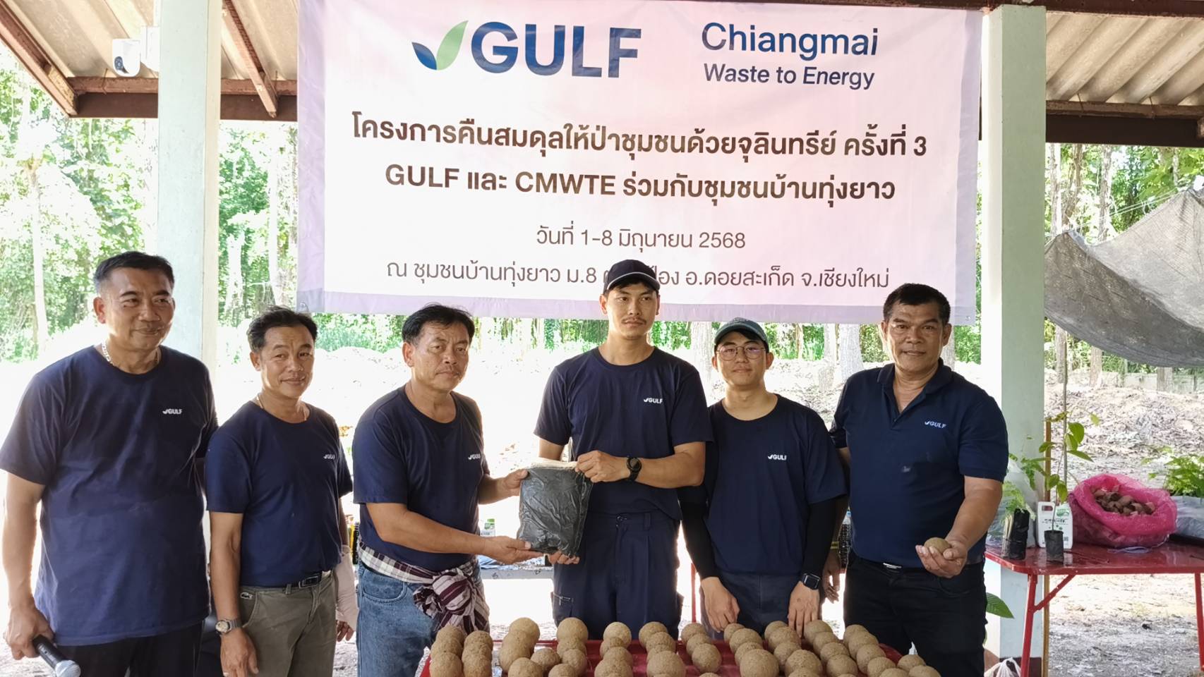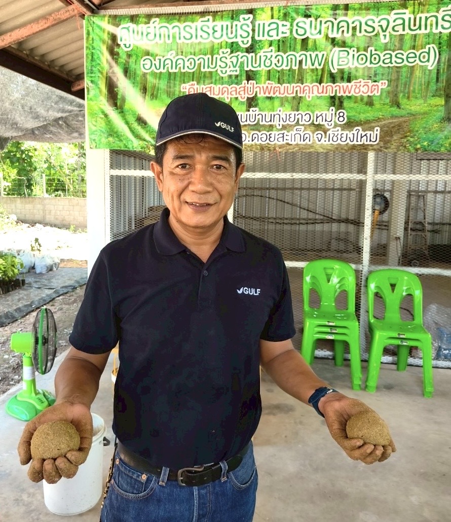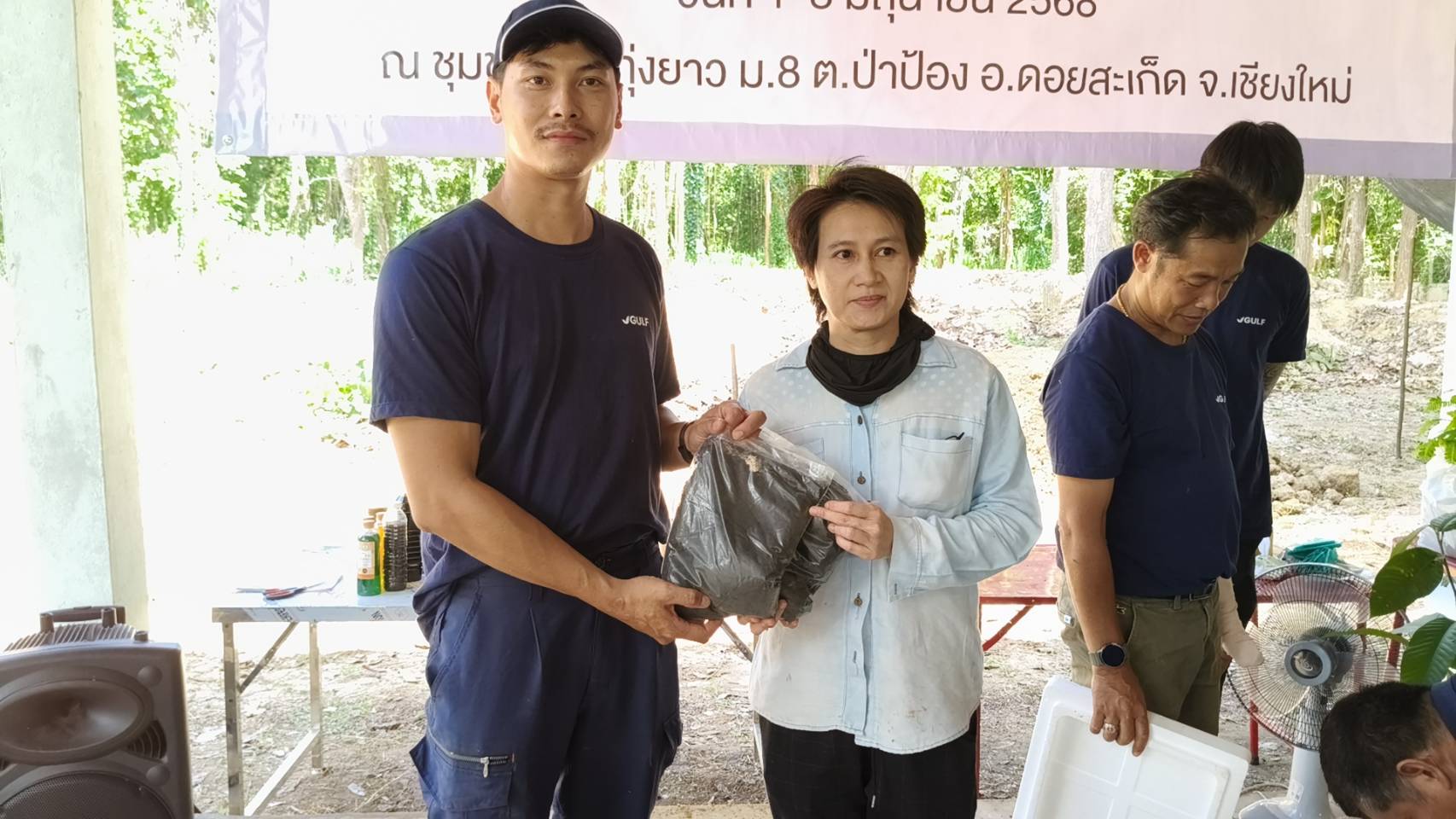 นายจิรศักดิ์ มีสัตย์ ผู้บริหาร กลุ่มบริษัทกัลฟ์ (Gulf) โครงการ คืนสมดุลให้ป่าชุมชนด้วยจุลินทรีย์ ตั้งแต่ปี 2566 โดยเข้ามาส่งเสริมกระบวนการเรียนรู้ด้านฐานชีวภาพ ซึ่งเป็นกลไกสำคัญในการพัฒนาป่าไม้และระบบนิเวศน์ โดยเริ่มต้นจาก อบรมองค์ความรู้เกี่ยวกับระบบนิเวศน์สิ่งแวดล้อม และจุลินทรีย์ ส่งเสริมการจัดตั้งศูนย์เรียนรู้และธนาคารจุลินทรีย์ชุมชน ซึ่งจะนำมาใช้นระบบการฟื้นฟูป่าไม้และการเกษตรและเศรษฐกิจรายได้ของ และได้ร่วมกับชุมชนในกิจกรรมป้องกันไฟป่า และในช่วงวันที่ 1 มิถุนายน 2568 ผ่านมา ได้นำผู้นำชุมชนและคณะกรรมการอนุรักษ์ป่าชุมชน ไปอบรมที่ มูลนิธิเห็ดไมคอร์ไรซ่าฯ นักวิจัยจาก มหาวิทยาลัยแม่โจ้แพร่ เรียนรู้วิธีการขยายเชื้อเห็ดไมคอร์ไรซ่า นำมาใส่ในต้นกล้าไม้เพื่อเพิ่มศักยภาพในการเติบโตป้องกันโรค ทนทานต่อสิ่งแวดล้อม ฯลฯ และมีเห็ดให้เราเก็บกินได้ และไม้แข็งแรงโตเร็วกว่าปกติ เป็นงานวิจัยที่ประสบผลสำเร็จและชุมชนสามารถทำได้สำเร็จจำนวนมากแล้ว ทางชุมชนของเราได้ไปศึกษาดูงานมาแล้ว สำหรับวันนี้ เป็นขั้นตอนการปฏิบัติการที่บริษัทฯสนับสนุนเชื้อเห็ดเผาะ เห็ดตับเต่าและอื่นๆ ซึ่งเป็นเชื้อไมคอร์ไรซ่า และพันธุ์กล้าไม้ที่ใส่เชื้อเห็ดมาปลูกเป็นแปลงทดลอง แปลงนำร่องเพื่อขยายผลสู่ชุมชนและป่าไม้ของเราให้เกิดความอุดมสมบูรณ์ต่อไป และจะมีโอกาสขยายเป็นกิจกรรมพัฒนารายได้ อาชีพ และเศรษฐกิจชุมชนได้ในหลายผลิตภัณฑ์ในอนาคต โดยบริษัทฯจะมีนักส่งเสริม นักวิชาการ และสร้างความร่วมมือของหน่วยงานต่างๆมาร่วมกันเพื่อสร้างพลังแห่งการอนุกร์ฟื้นฟูและพัฒนาป่าไม้ชุมชนของเราทุกคนให้อุดมสมบูรณ์คู่กับวิถีชีวิตของชุมชนอย่างยั่งยืนต่อไป บริษัทฯให้ความสำคัญยิ่งต่อชุมชน และจะเป็นส่วนหนึ่งที่ร่วมสนับสนุนชุมชนต่อไป