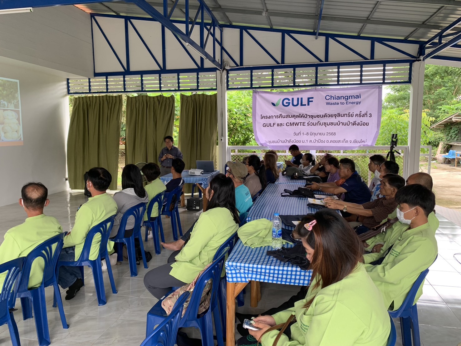 กำนันสมพงค์ กล่าวทิ้งท้ายว่า ปัจจุบันเราได้พัฒนาความรู้มากขึ้นมาก และจัดตั้งองค์กรขับเคลื่อนเป็นศูนย์เรียนรู้และธนาคารจุลินทรีย์ ฯ ที่จะเสริมประสิทธิภาพการทำงานมากยิ่งขึ้น เรามีความรู้และโอกาสพัฒนา ผลิตภัณฑ์ชุมชน และ มีการการสื่อสารและเกิดการประสานความร่วมมือหน่วยงานทุกภาคส่วนมากยิ่งขึ้น ซึ่งเป็นการเสริมแรงเพิ่มศักยภาพเป็นพลังขับเคลื่อนงานอนุรักษ์ป่าพัฒนาสิ่งแวดล้อมและเศรษฐกิจชุมชนอย่างเป็นระบบขึ้น ตอนนี้ผมและคณะทำงานมีความเชื่อมั่นและได้เกิดผลประโยชน์ต่อชุมชนแล้วในขณะนี้ มีการฟื้นฟูป่าชุมชนมากขึ้นเป็นลำดับ เราจะมุ่งมั่นขับเคลื่อน บนยุทธศาสตร์ “หุบเขาจุลินทรีย์แห่งดอยสะเก็ด ” คืนสมดุลให้ป่าชุมชนด้วยจุลินทรีย์ เพื่อคุณภาพชีวิตที่ดีของชุมชน เพื่อสิ่งแวดล้อมและระบบนิเวศนที่ดีของชาวดอยสะเก็ดและจังหวัดเชียงใหม่ ขอขอบคุณทุกภาคส่วนที่ได้ร่วมมือกันตลอดมา และ ขอบคุณยิ่งในการส่งเสริมและสนับสนุนจาก GULF -CMWTE ครับ ขอบคุณพี่น้องประชาชน ชาวตำบลป่าป้อง ชาวดอยสะเก็ด และเครือข่ายลุ่มน้ำชุมชนทุกแห่ง เราจะร่วมกันรักษาป่าไม้และสิ่งแวดล้อมร่วมกันเพื่อเราทุกคน ขอขอบคุณ ครับ