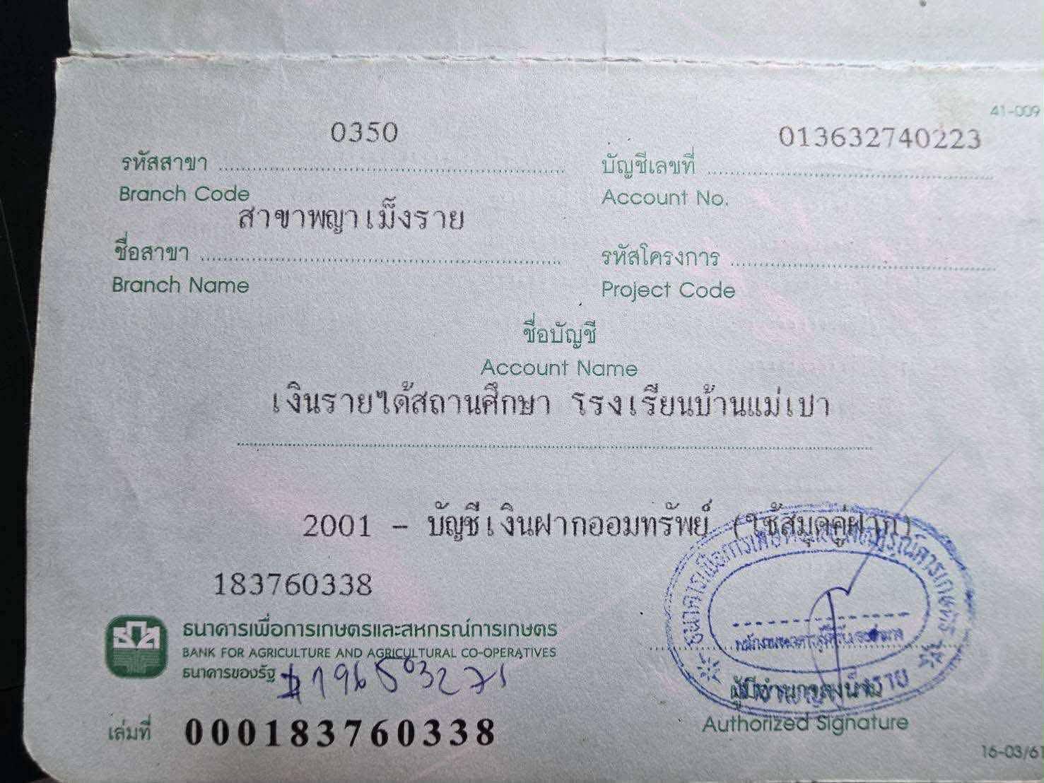 ชื่อบัญชี: เงินรายได้สถานศึกษาโรงเรียนบ้านแม่เปา