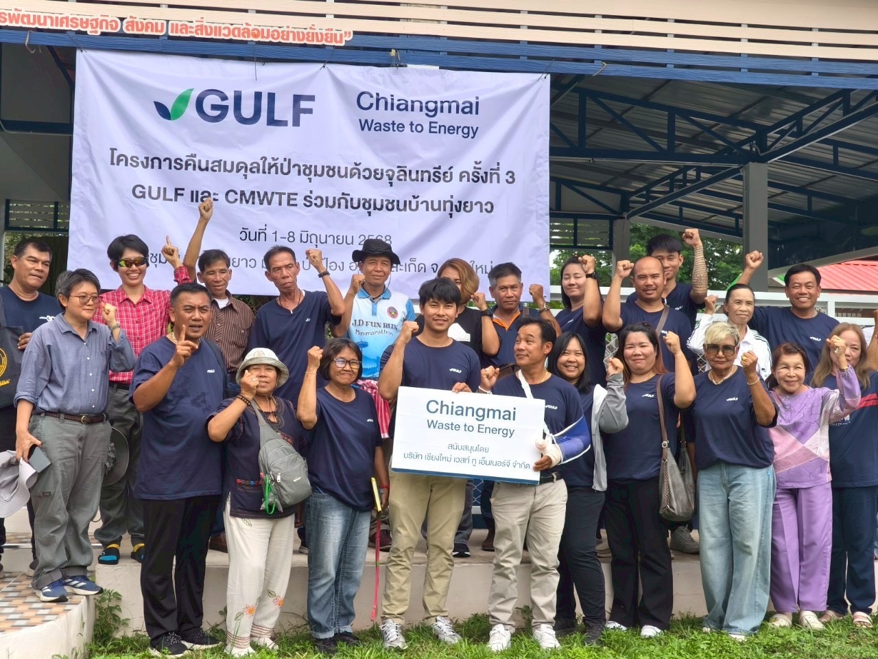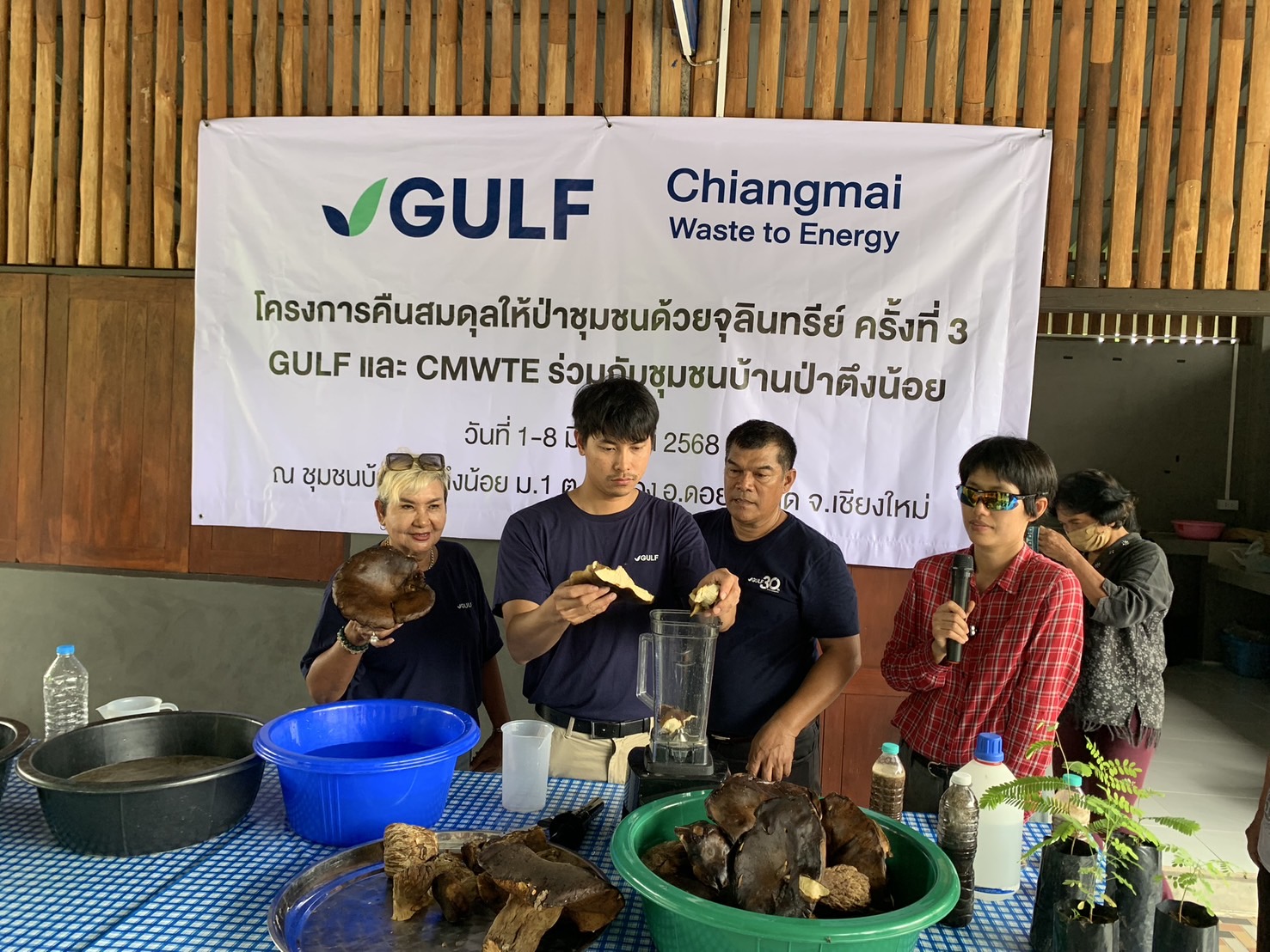 เมื่อเร็วๆนี้ ( 7-10 ตุลาคม 2568) กลุ่มบริษัทกัลฟ์ (GULF) และบริษัทเชียงใหม่ เวสท์ ทู เอ็นเนอร์จี จำกัด (CMWTE) ได้จัดกิจกรรมส่งเสริมชุมชน บ้านทุ่งยาว หมู่ 8 ต.ป่าป้อง อ.ดอยสะเก็ด จ.เชียงใหม่ ภายใต้โครงการ “ GULF คืนสมดุลให้ป่าด้วยจุลินทรีย์ ปีที่ 3 “ ซึ่ง ในช่วง 3 ปีที่ผ่านมา ตั้งแต่ ปี 2565-2568 ได้ร่วมกับชุมชนในการอนุรักษ์ฟื้นฟูป่าชุมชนห้วยต้นยาง หมู่ 8 ต.ป่าป้อง อ.ดอยสะเก็ด จ.เชียงใหม่ ซึ่งเป็นป่าต้นน้ำของจังหวัดเชียงใหม่ มีพื้นที่กว่า 2,307 ไร่ นำโดย ดร.กฤษณ์ พงษ์เทพิน ผช.ผอ.ฝ่ายชุมชนสัมพันธ์ GULF วิทยากรส่งเสริมฯ และ นายสมพงค์ เจริญศิริ กำนันตำบลป่าป้อง อ.ดอยสะเก็ด จ.เชียงใหม่ ผู้นำนักอนุรักษ์ป่าชุมชนห้วยต้นยาง ฯ กิจกรรมสำคัญที่ผ่านมา ได้ร่วมกับชุมชน ทำแนวกันไฟป่า การปลูกป่าเพิ่มเติม ได้ร่วมกับมูลนิธิเกษตรธรรมชาติและสิ่งแวดล้อมจัดอบรมความรู้เกี่ยวกับจุลินทรีย์และระบบนิเวศฐานชีวภาพแก่ชุมชน และ สนับสนุนการจัดตั้งศูนย์เรียนรู้และธนาคารจุลินทรีย์ชุมชน และส่งเสริมการผลิตจุลินทรีย์ชีวภาพเป็นผลิตภัณฑ์ชุมชนเพื่อนำ มาใช้ในการหมักใบไม้เป็นปุ๋ยลดเชื้อเพลิงในป่า การทำปุ๋ยน้ำชีวภาพ ปุ๋ยหมัก จุลินทรีย์ก้อนบำบัดน้ำเสีย การผลิตสารปรับปรุงดิน การเพาะพันธุ์กล้าไม้ ฯลฯ