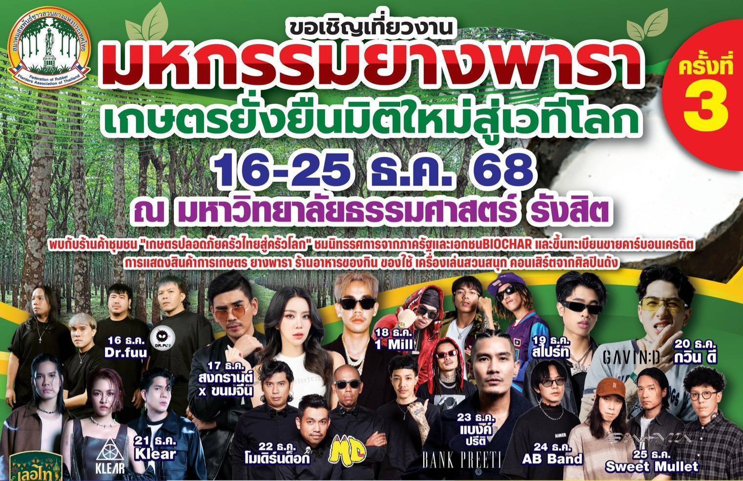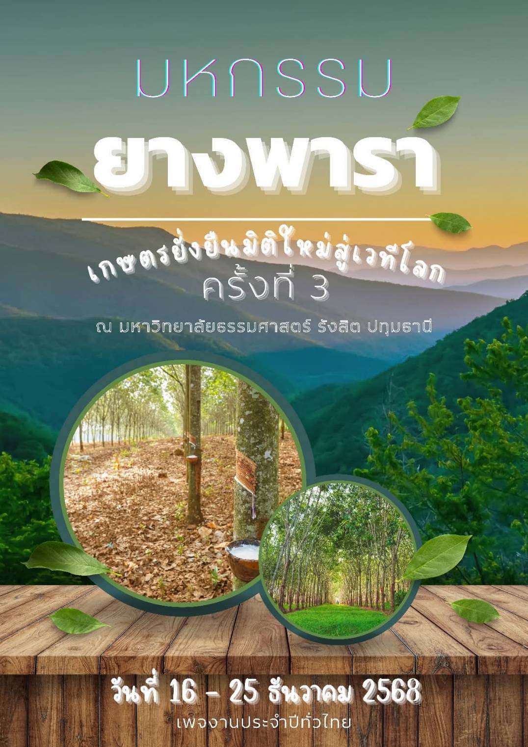จึงขอเชิญผู้ประกอบการยางพารา เกษตรกร ผู้ผลิตสินค้าเกษตร ผู้ประกอบการอุตสาหกรรม สมาชิกสภาอุตสาหกรรม หอการค้า และนักธุรกิจทั่วประเทศ เข้าร่วมงาน “มหกรรมยางพารา ครั้งที่ 3” งานใหญ่ด้านเกษตร–ยางพารา–นวัตกรรมพลังงานทดแทน ที่มุ่งขับเคลื่อนเศรษฐกิจฐานรากสู่ตลาดโลก และเตรียมประเทศไทยก้าวเข้าสู่เศรษฐกิจสีเขียวอย่างยั่งยืน หรือติดต่อสอบถามได้ที่ 080 4242299
