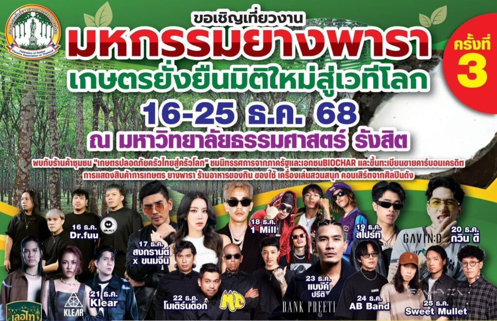 ดร.อุทัย สอนหลักทรัพย์ นายกสมาคมสหพันธ์ชาวสวนยางแห่งประเทศไทย เปิดเผยว่า ในวันที่ 16-25 ธันวาคมนี้ สมาคมสหพันธ์ชาวสวนยางแห่งประเทศไทย กำหนดจัด “มหกรรมยางพารา เกษตรยั่งยืน มิติใหม่สู่เวทีโลก” ครั้งที่ 3 ณ ลานพญานาค มหาวิทยาลัยธรรมศาสตร์ ศูนย์รังสิต เพื่อเชิญชวนนักลงทุนชาวไทยและต่างประเทศให้มาลงทุนเพิ่มมากขึ้น และเป็นศูนย์กลางเชื่อมโยงประสานงานจําหน่ายยางและผลิตภัณฑ์ยางพาราสู่ผู้ใช้ได้โดยตรง โดยเฉพาะทำให้เกษตรกรได้รับความรู้ในการลดต้นทุน เพิ่มผลผลิต และมีรายได้ที่มั่นคง นอกจากนี้ ยังให้นักท่องเที่ยวได้มีโอกาสรับประทานอาหารเพื่อสุขภาพ “เกษตรปลอดภัย ครัวไทยสู่ครัวโลก” ทั้งนี้ ในวันที่ 16 ธันวาคม นายอนุทิน ชาญวีรกูล นายกรัฐมนตรี จะให้เกียรติมาเป็นประธานเปิดงาน พร้อมเป็นพยานในการลงนาม MOU ระหว่างสมาคมสหพันธ์ชาวสวนยางแห่งประเทศไทย กับเครือข่ายอีกด้วย ดังนั้น จึงเชื่อว่าการจัดงานครั้งนี้ทุกหน่วยงาน ทุกเครือข่าย จะได้รับความรู้จากนักวิชาการและผู้นําเกษตรกรทั่วประเทศ ซึ่งจะนําประสบการณ์มาแลกเปลี่ยนระหว่างกัน ทั้งในรูปแบบของการนิทรรศการด้านวิชาการยาง ลดต้นทุน เพิ่มผลผลิตเกษตรปลอดภัย ครัวไทยสู่ครัวโลก การสัมมนาเรื่อง คาร์บอนก้าวไกล คนยุคใหม่ใส่ใจสิ่งแวดล้อม และอื่นๆ