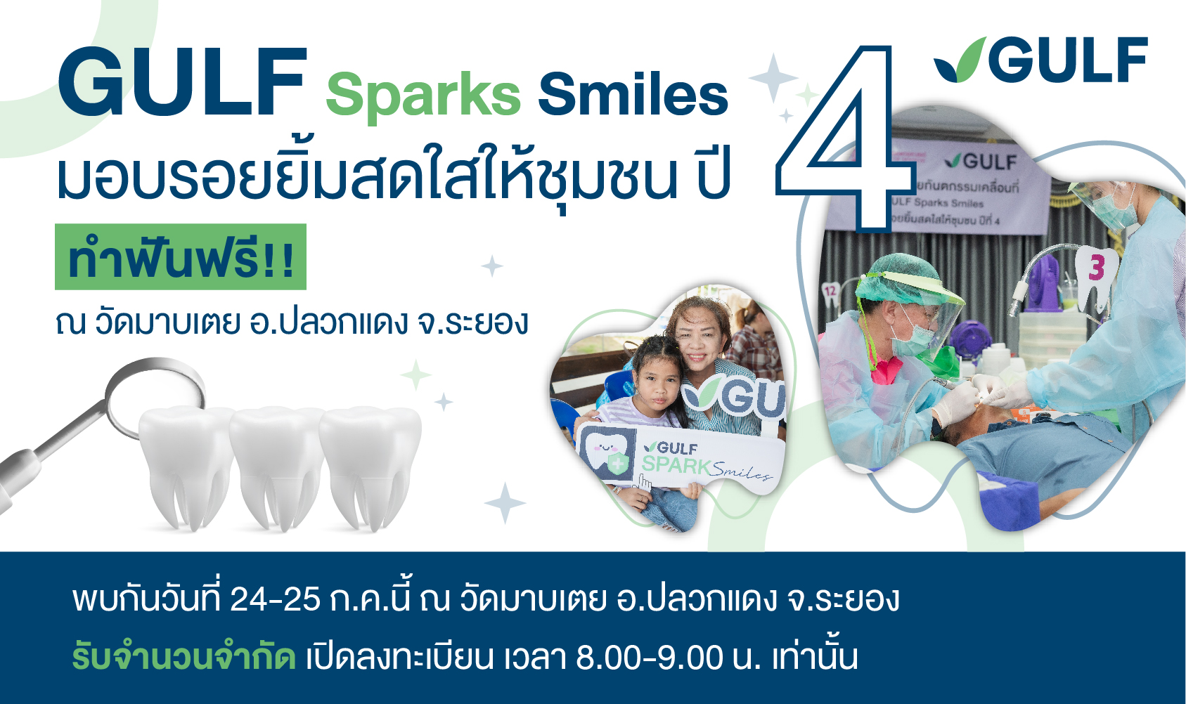 บริษัท กัลฟ์ เอ็นเนอร์จี ดีเวลลอปเมนท์ จำกัด (มหาชน) หรือ กัลฟ์ ร่วมกับ คณะทันตแพทยศาสตร์ จุฬาลงกรณ์มหาวิทยาลัย เดินหน้าต่อกับโครงการออกหน่วยทันตกรรมเคลื่อนที่ “GULF Sparks Smiles มอบรอยยิ้มสดใสให้ชุมชน ปี 4” หน่วยที่ 3 ของปี ลงพื้นที่ให้บริการทำฟันฟรีกับประชาชน ณ วัดมาบเตย อ.ปลวกแดง จ.ระยอง ในวันที่ 24 – 25 กรกฎาคม 2567 โดยจะเปิดรับลงทะเบียนสำหรับผู้ที่ walk-in ในช่วง 8.00 – 9.00 น. เท่านั้น (รับจำนวนจำกัด)