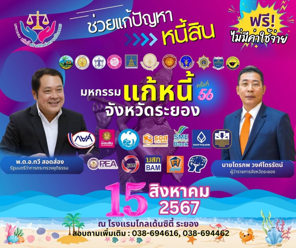 📣ข่าวดีกระทรวงยุติธรรม โดย พ.ต.อ.ทวี สอดส่อง รัฐมนตรีว่าการกระทรวงยุติธรรม และจังหวัดระยอง โดยนายนายไตรภพ วงศ์ไตรรัตน์ ผู้ว่าราชการจังหวัดระยอง เชิญชวนลูกหนี้ชาวจังหวัดระยอง ร่วมงาน “มหกรรมแก้หนี้ สร้างวิถีแห่งความเป็นธรรม” ครั้งที่ 56 จังหวัดระยอง ประจำปีงบประมาณ พ.ศ. 2567